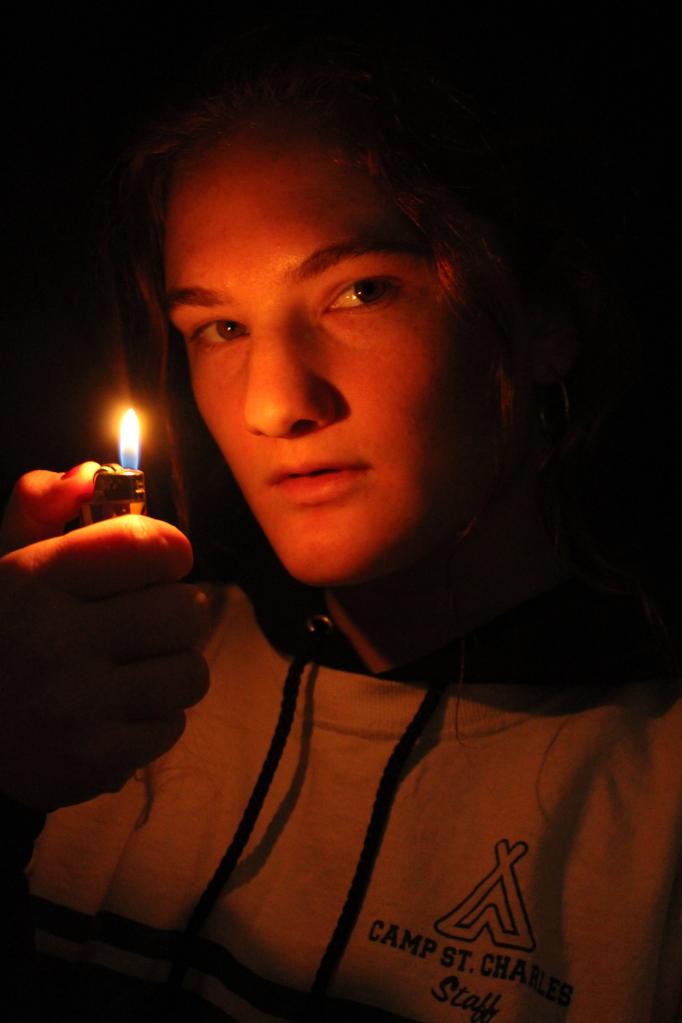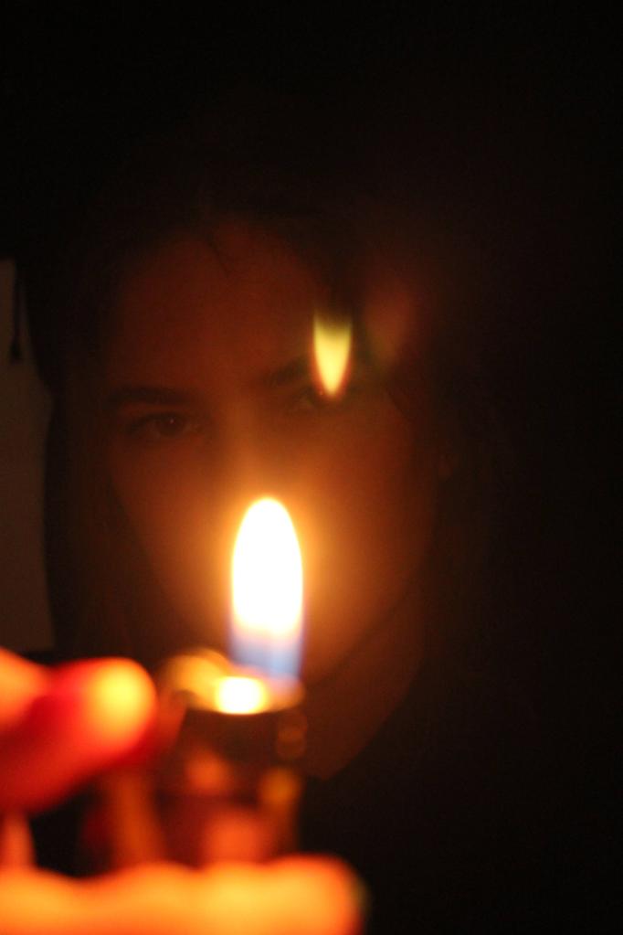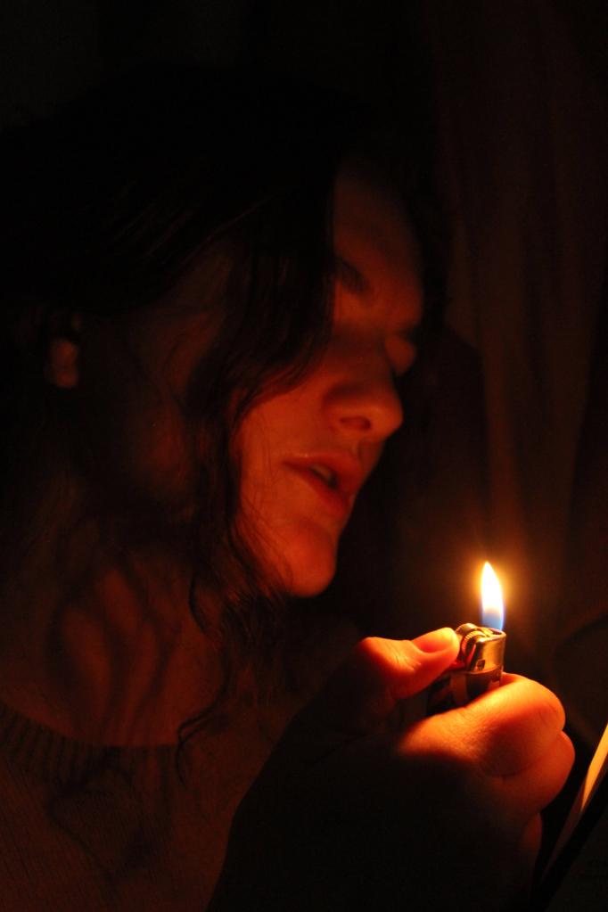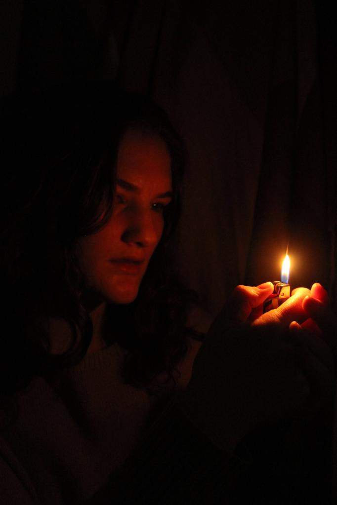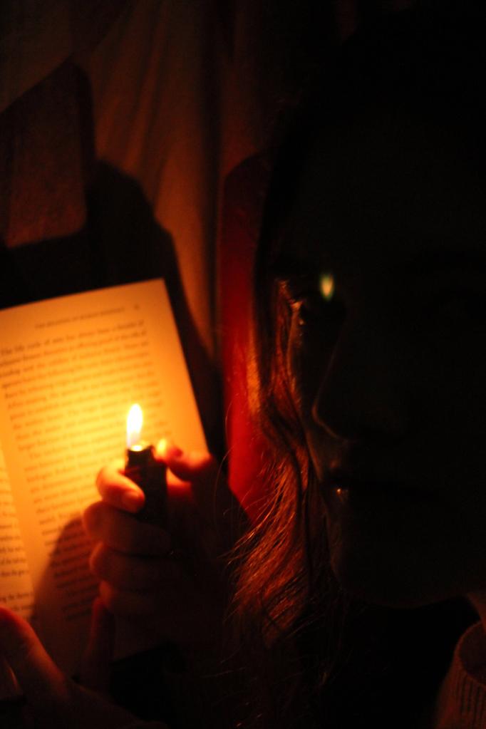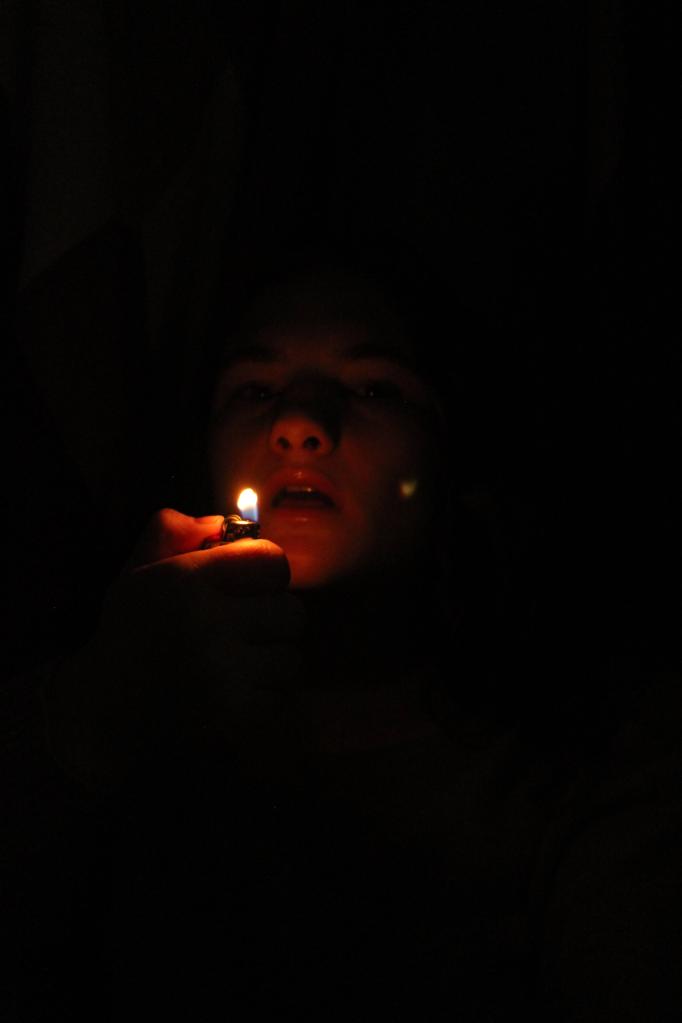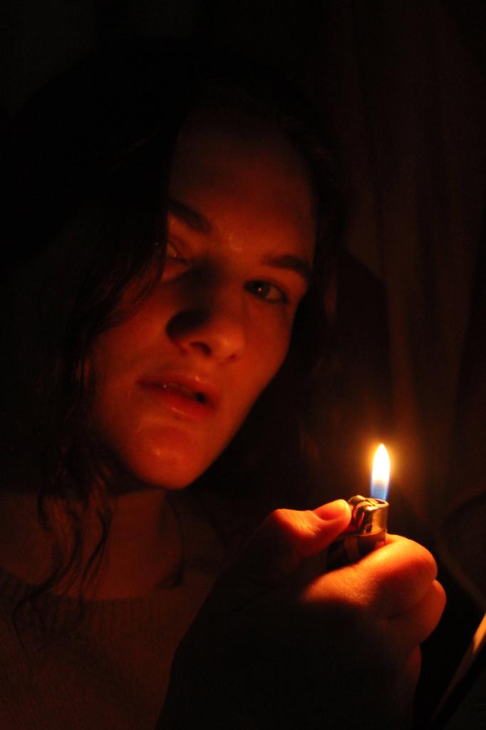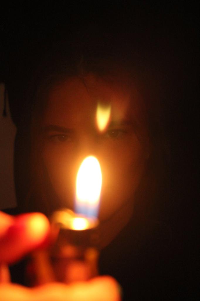 I started out with what has become my normal self-portrait style: fairly close up, but not too much. After a few shots, however, I realized that that wasn’t going to cut it with this style or mood, and I needed to zoom in much closer to really pick up on the detail the lighter was revealing. I zoomed in more, added a prop book, tried changing where I was holding the lighter, put my hair up– but nothing really seemed to (excuse the pun) spark. I decided that it was the lighting, and despite all I was doing to try and get the lighter to be the only light source in the photo, that simply wasn’t going to work. At that point, however, I was tired from a long day and unexciting results, so I waited until the next day to get back at it, deciding to devote the bulk of the day to different photography tasks. (Included below are some of those unexciting results, by the way. While I liked a few of the photos, they were so far from what I had set out to achieve that I didn’t get further inspired by them, and even would go so far as to say I was becoming uninspired.)