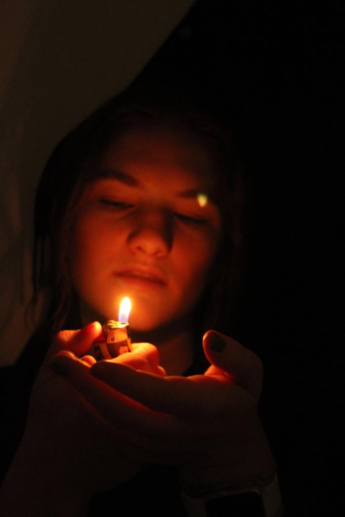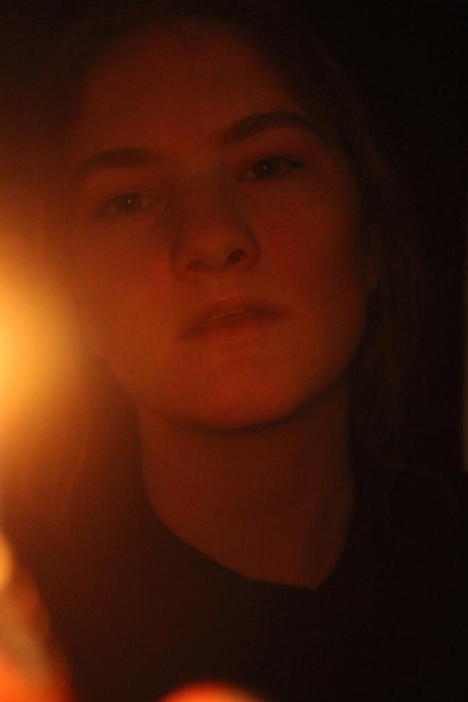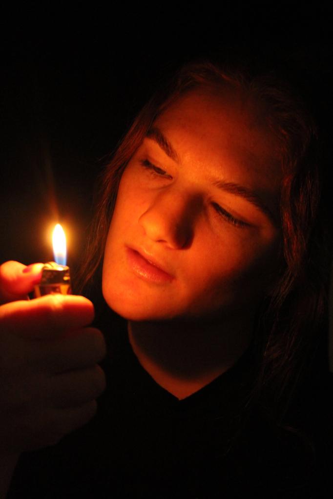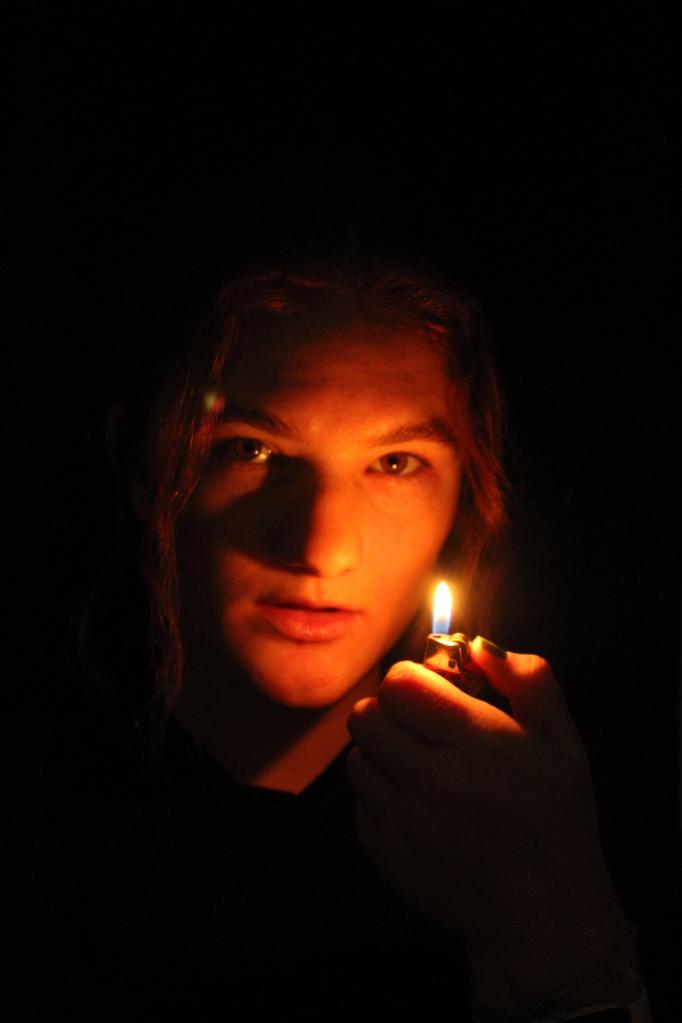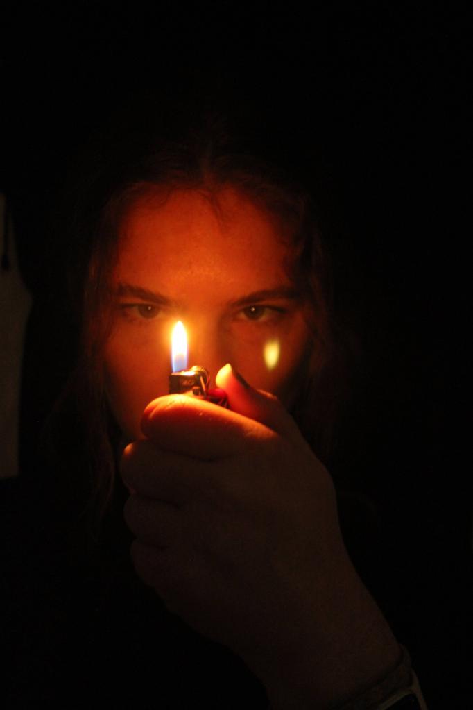 The next time I shot, it was a couple days later. I started shooting in the evening, around 7 pm. While I still had the same vibe in mind, I decided to change a few of the elements in hopes of better inspiration. I changed the background to black, and donned a black mock-neck as well. I still kept hair and makeup rather natural, however. The sun was still completely set, so keeping in mind my lighting problems from before, I decided to keep my closet light and bedside table light on, allowing for a bit more light. This allowed for more light for the photoshoot, while still making it seem as though the shot was lit only from the lighter. I took a couple test shots before getting dressed for the shoot, and they turned out pretty decent composition-wise, so I decided to proceed:
