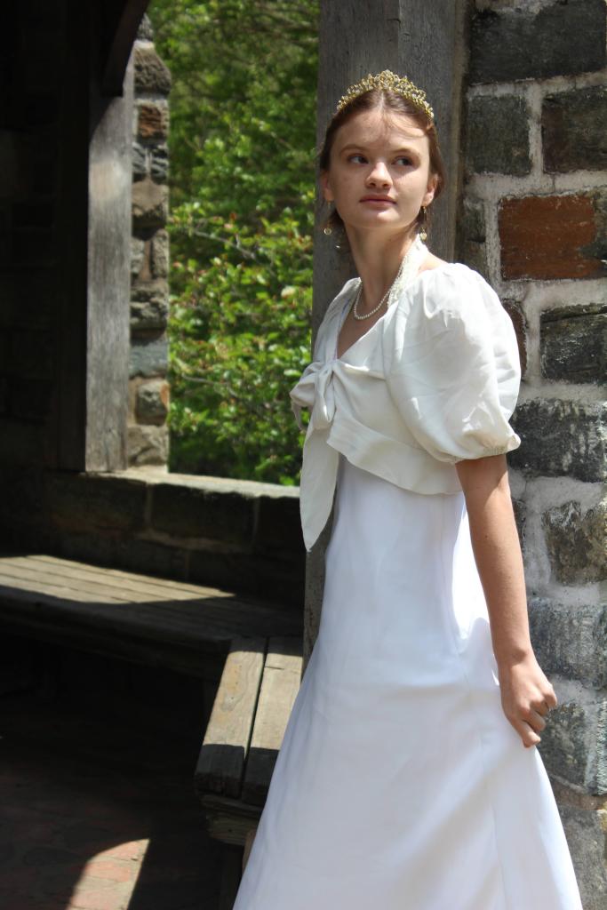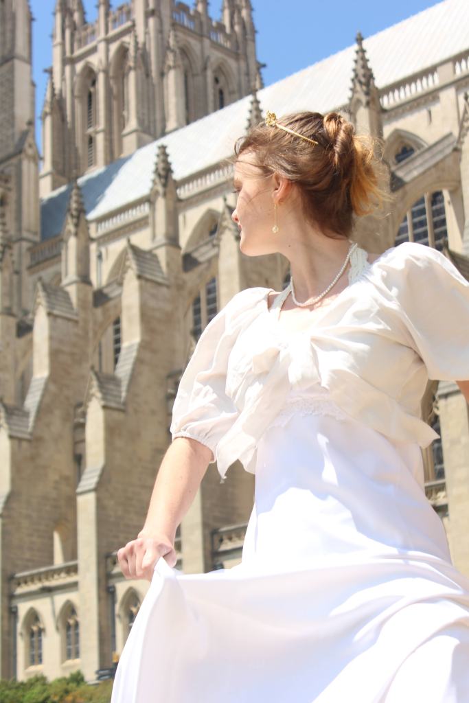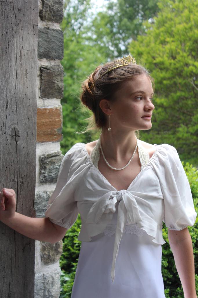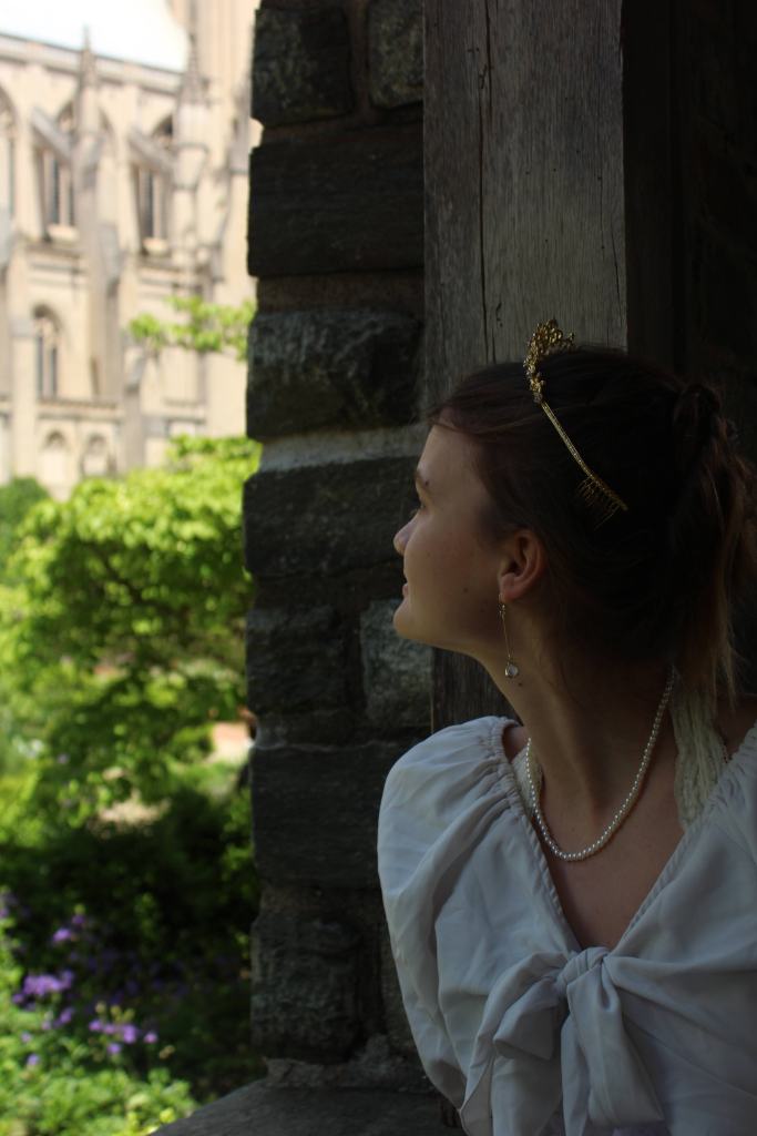 I ended up doing the photoshoot on Saturday. The gardens open at 8 am each day, so we planned on waking up a bit early to get ready for the photoshoot and drive down there. However, rain in the morning hindered that plan, so we ended up getting ready and leaving around noon. In addition to the outfit, I gave Kate some dainty accessories– a pearl necklace, delicate gem-dropped earrings, and even a golden tiara.