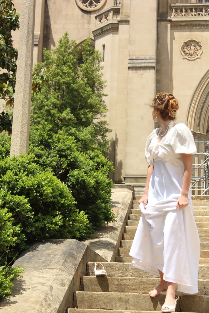 I found the perfect location, only a half hour away, in The Bishop’s Garden. Bishop’s Garden is a garden located by the National Cathedral, and has incredible greenery as well as fountains, gazebos, stairs, and a castle-looking cathedral in the background. I determined this would be perfect to capture images of Cinderella’s time at the castle, both enjoying the ball as well as running from the palace. Here are some photos I found online of the gardens to give you a better idea.